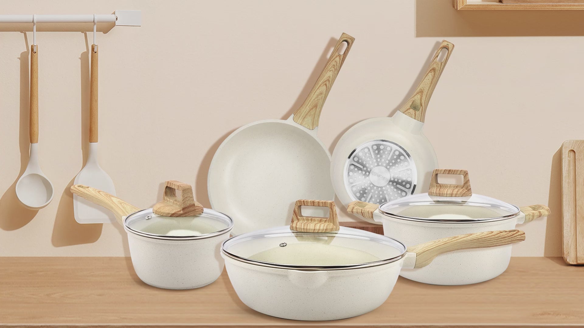 - 【Super Non-stick & Effortless Cleaning】Our non stick pots and pan set has a ultra smooth and highly non-stick surface that allows eggs to slide off the frying pan effortlessly with nothing sticks. Making your cleaning a breeze, just wipe with paper towels or rinse with water, less CO2 emissions and less water waste. Dishwasher safe, not for use in ovens.